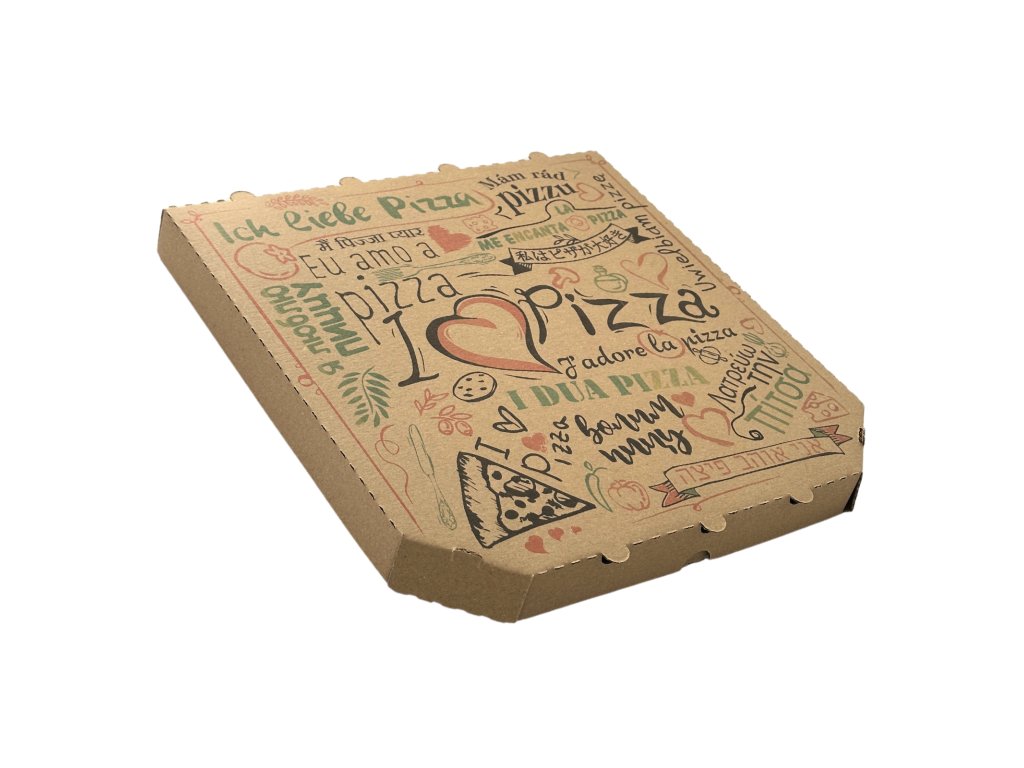 pizza krabice 32x32x3 cm, hnědá, potisk I love pizza, zkosené hrany (100 ks/balení)
